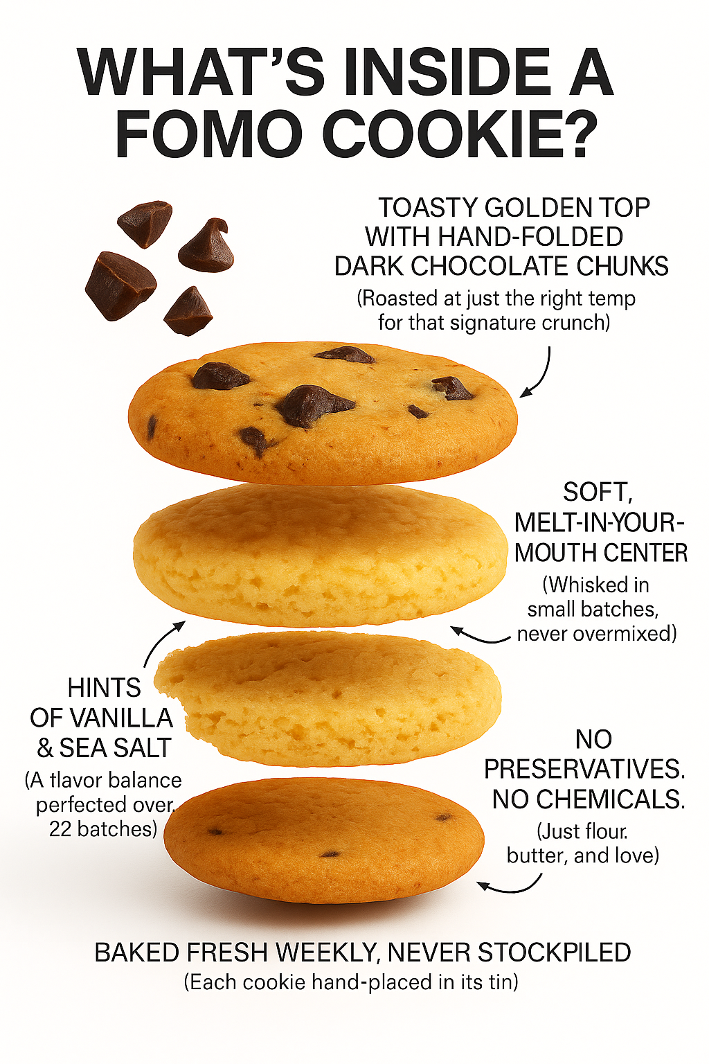 FOMO’s Classic Choco Chip Cookies go full size in this indulgent 4-pack, tucked inside a chunky, reusable tin. Each cookie is oversized, soft, crumbly, packed with premium chocolate chunks, and baked to perfection.